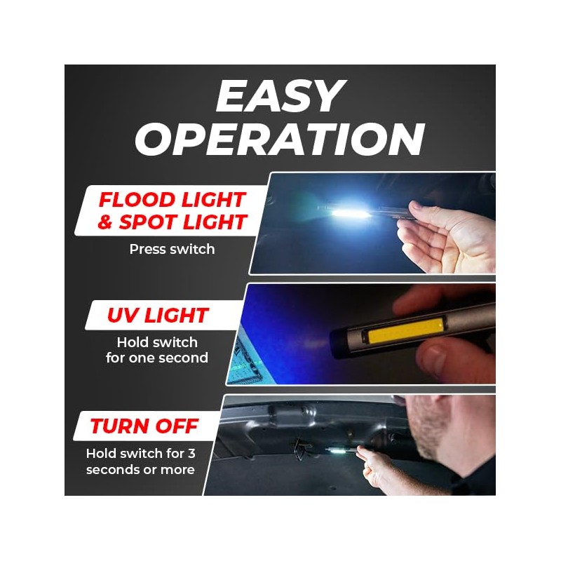 - Bright & Mulit-Mode: This COB LED Flashlight is has 3 different modes including a pen light, flood light, and 365nm UV light. This worklight will help to illuminate the darkest of spaces and has the perfect mode for any situation. This super bright worklight is the perfect gift for Dad.
