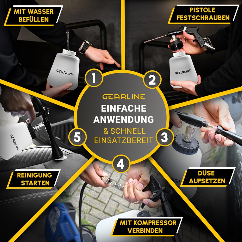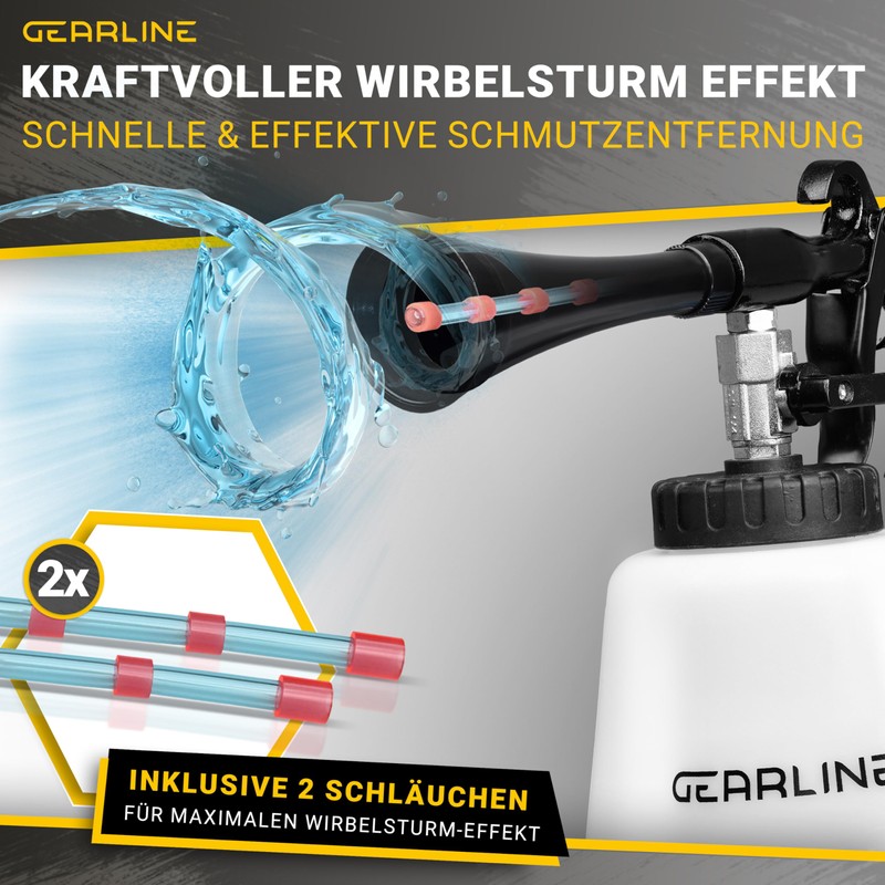 GEARLINE Compressed Air Cleaning Gun [with Swirl Jet Technology] - Effective Air Pressure Gun for Car Cleaning & More - All-in-One Set with Compressed Air Gun, Water Tank & 2 Nozzle Attachments