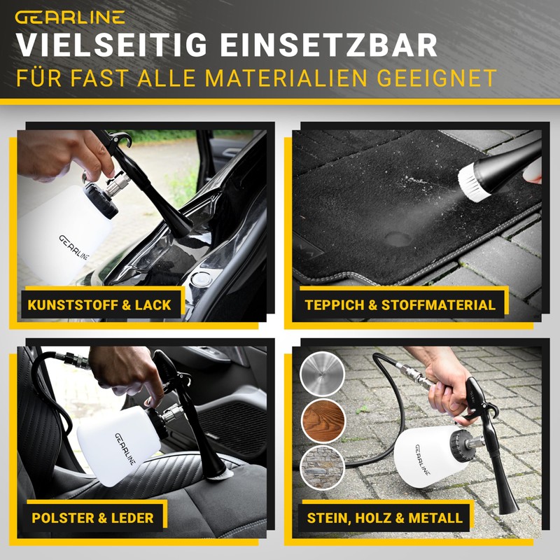 - Strong cleaning – the GEARLINE air pressure cleaner quickly and reliably removes dirt, dust and deposits and ensures thorough cleanliness in the car and on many other surfaces