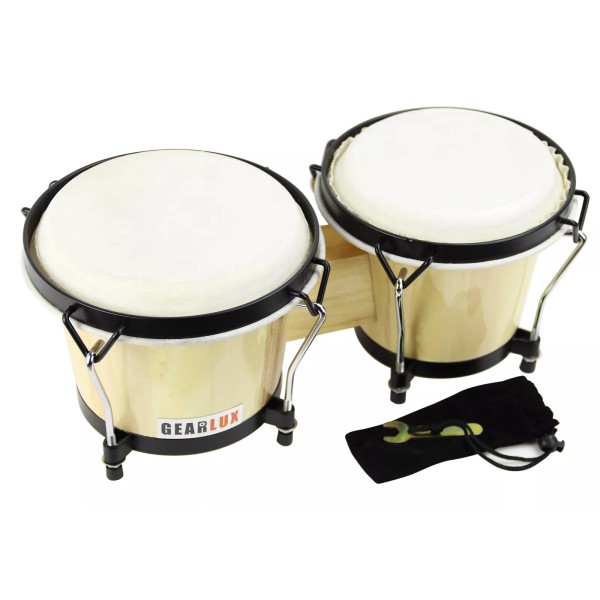 Gearlux Tunable Bongos are an ideal beginner pair of bongo drums designed to produce a great sound with versatile tones. With 6- and 7-inch heads, these natural light wood finish bongos are easily transportable and great fun as part of an acoustic set at any standard. The bongos are fitted with skin heads and metal top and bottom hoops each with four tuning lugs that can be individually tuned using the included tuning key to achieve the perfect sound. Robustly built to cope with not only had playing but also the general rough and tumble in either a classroom or performance, these Gearlux bongos are a highly popular and recommended, affordable choice!