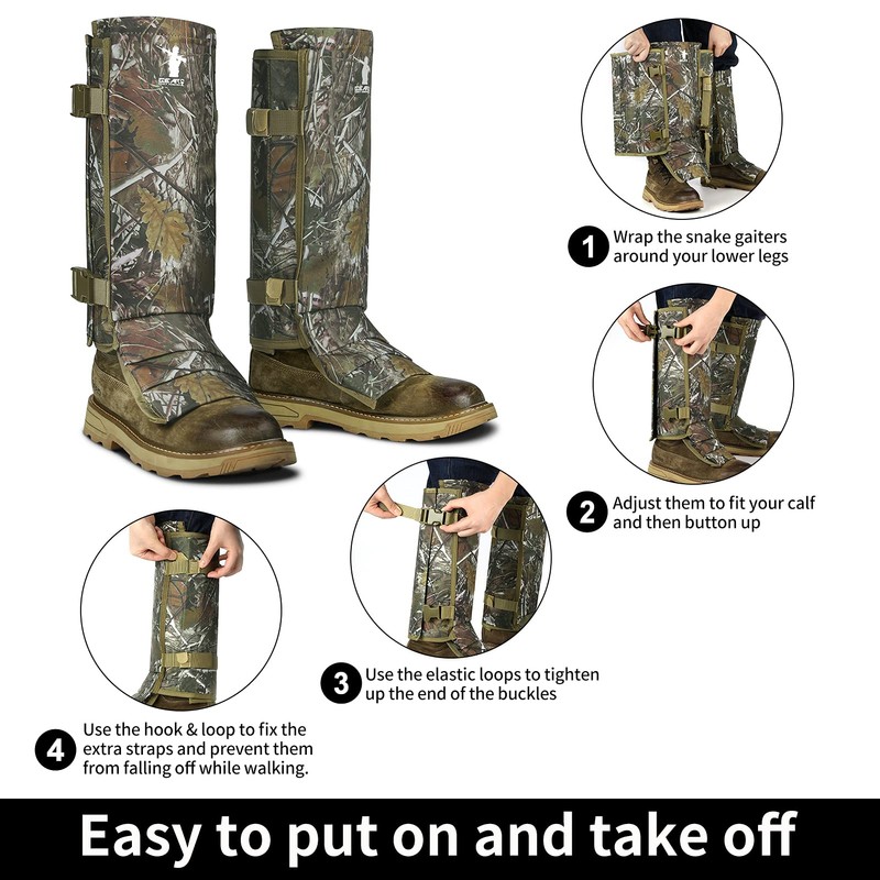- 🐍 Adjustable Size: GearOZ snake guards are designed to fit calf sizes from 12 to 20 inches. With elastic straps, buckles and two extra loops, your gaiters can be easily tightened up and keep firm on your lower legs.