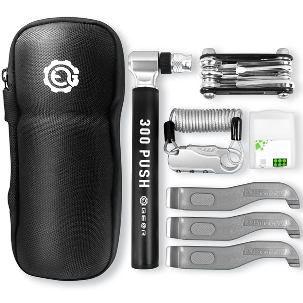 - Contents: Emergency first aid set with tool case, portable pump, multi-tool, tire lever, patch, wire lock