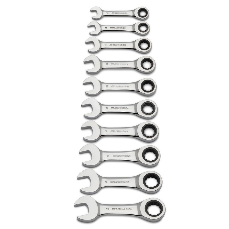 - Includes: 10mm, 11mm, 12mm, 13mm, 14mm, 15mm, 16mm, 17mm, 18mm and 19mm Stubby Combination GearWrench