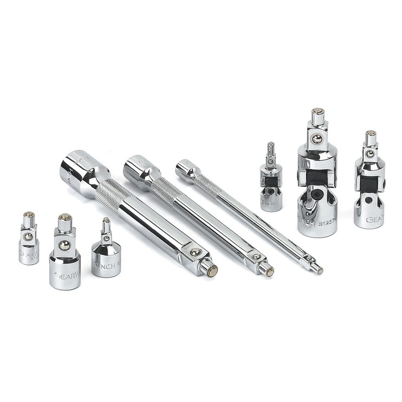 Gear wrench 9-Piece magnetic drive tool set consisting of 81225 1/4-Inch drive magnetic universal joint, 81226 3/8-Inch drive magnetic universal joint, 81257 1/2-Inch drive magnetic universal joint, 81258 1/4-Inch female to 3/8-Inch male magnetic adapter, 81259 3/8-Inch female to 1/4-Inch male magnetic adapter, 81260 1/2-Inch female to 3/8-Inch male magnetic adapter, 81261 6-Inch magnetic extension 1/4-Inch drive, 81262 6-Inch magnetic extension 3/8-Inch drive, and 81263 6-Inch magnetic extension 1/2-Inch drive. 9-Piece gear wrench set of magnetic attachments designed to be used with standard attachments and shallow sockets. Strong magnetic tips allow for contact through the base of the socket to hold nuts and bolts in place during use.