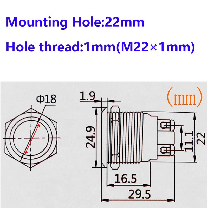 • Switch mounting hole:22mm;Push buttons hole thread:1mm.Rated current and voltage:12V 24V 36V 110V 125V 230V 250V.