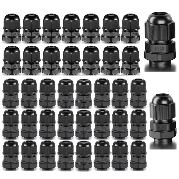 Gebildet 30pcs PG7 + 20pcs PG9 Cable Gland, Plastic IP68 Waterproof Adjustable 3-8mm Cable Gland Joint with Gaskets, M12 M16 Wire Connector, Wire Protector (Black)