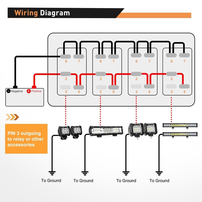 - WIDE APPLICATION Standard 5 pin switch, designed for 12V DC/20A and 24V DC/10A ideal for controlling LED light bar, LED work lights, fog lights, headlights, taillights and auxiliary lamps, etc. Widely used in cars, motorcycles, SUV, ATV, UTV, boat, marine, ship, yacht, etc.