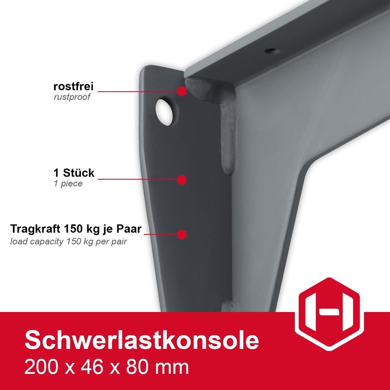 Gedotec Angle Heavy Duty Metal Shelf Brackets - MIRA | Depth: 200 mm | Heavy Duty Console Load Capacity 150 kg | Shelf Bracket Steel Grey | Material Thickness 6 mm | Pack of 1 - Wall Bracket for