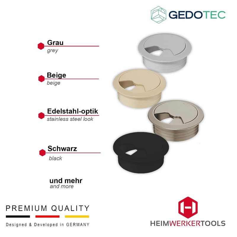 - Desk cable guide made of stable and durable plastic. Cable outlet for bushings in office furniture of power cables, USB cables, audio cables or as cable management for power and connection cables of printers, screens and much more. Our cable grommets with cable hole cover ensure organization on the kitchen countertop or desk top.