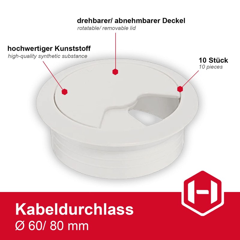 Gedotec Cable grommet desk made of sturdy ABS plastic, pack of 10 round cable passages, 80 mm, entry, cable box, white matt, cable guide for push-in, cable duct desk