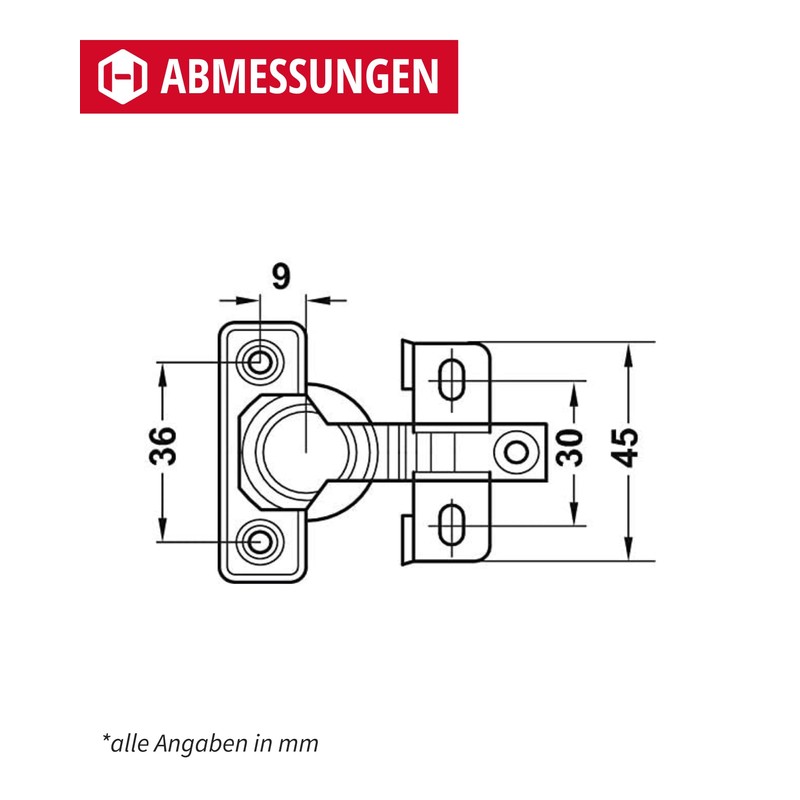 - Drilling pattern: 36/9 mm – Carvan & Boot pot hinge corner stop without locking mechanism – material: nickel-plated steel