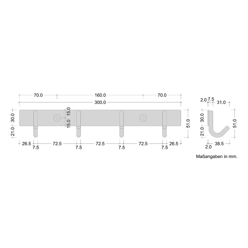 - Hook rail with 4 hooks Total length: 300 mm - Height: 45 mm - Depth: 40 mm - Hook width: 8 mm