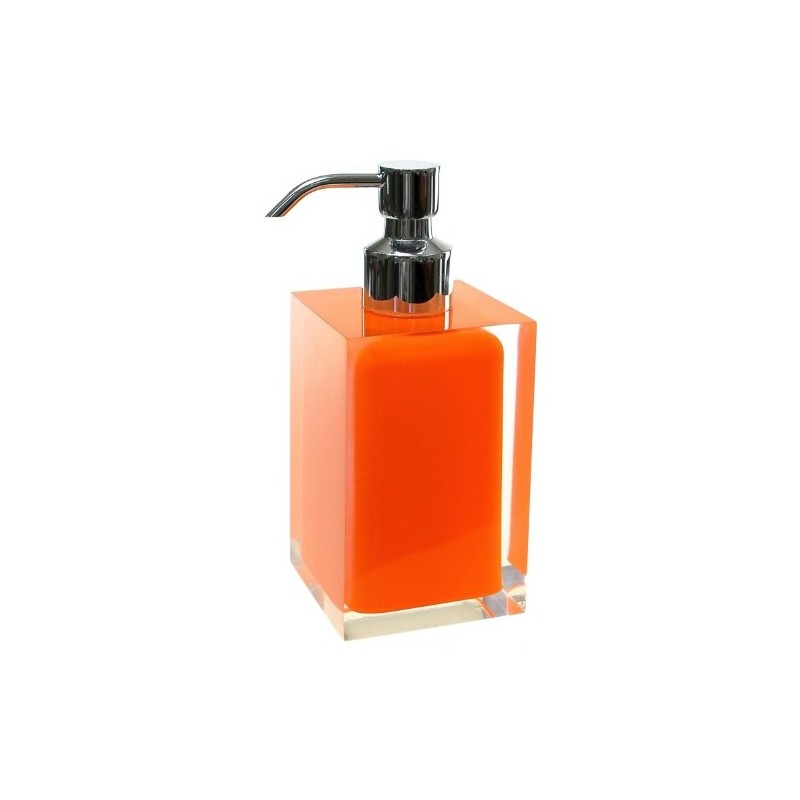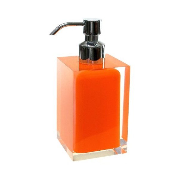 Modern, decorative square semi-transparent Orange hand soap dispenser with chromed brass hand pump. Soap dispenser container made from thermoplastic resins. Made in Italy by Gedy.
