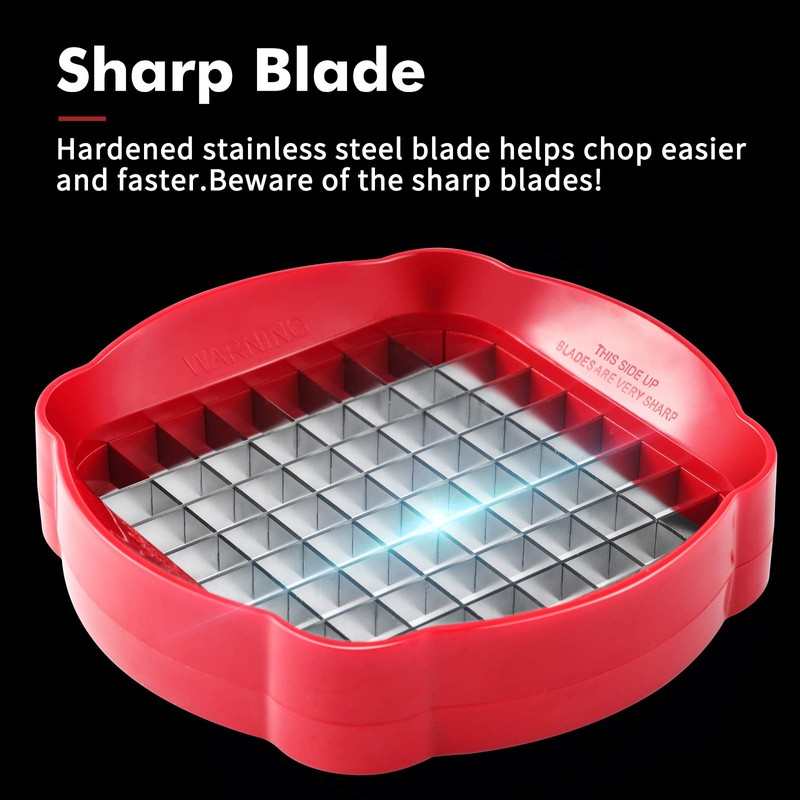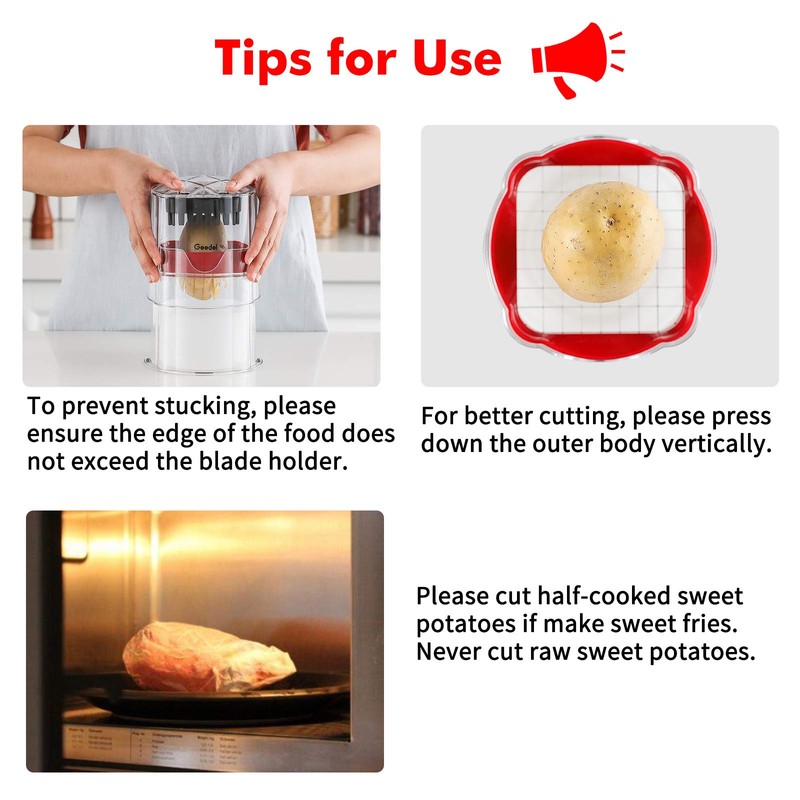 - 3 interchangeable blades: the stainless steel blades of the Geedel chip cutter are each for cubes, sticks and apple slices. Each blade is razor-sharp, and different blades meet your needs for different food shapes