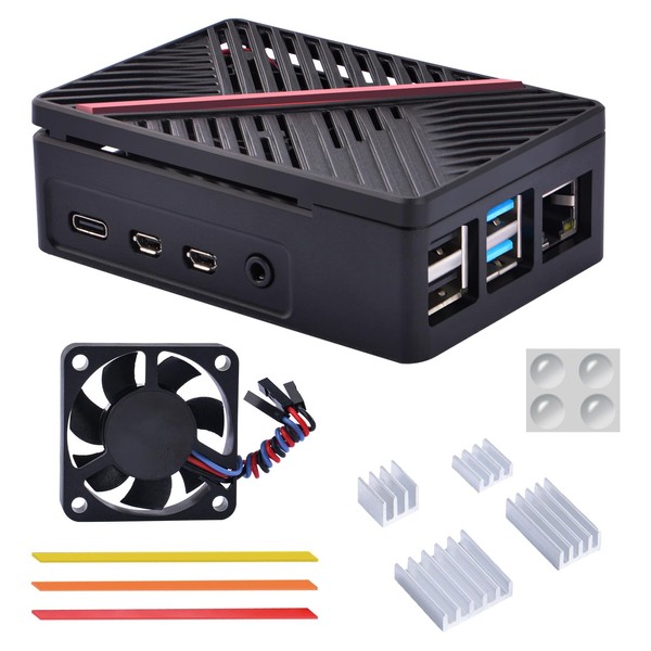 • Package Includes - 1x ABS Case for Raspberry Pi 4, 1x 4010 Cooling Fan, 4x Aluminum Heatsink, 1x Thermal Pads Pack, 1x Screw Pack, 1x Screw Driver, 3x Color bars (Red/Orange/Yellow)