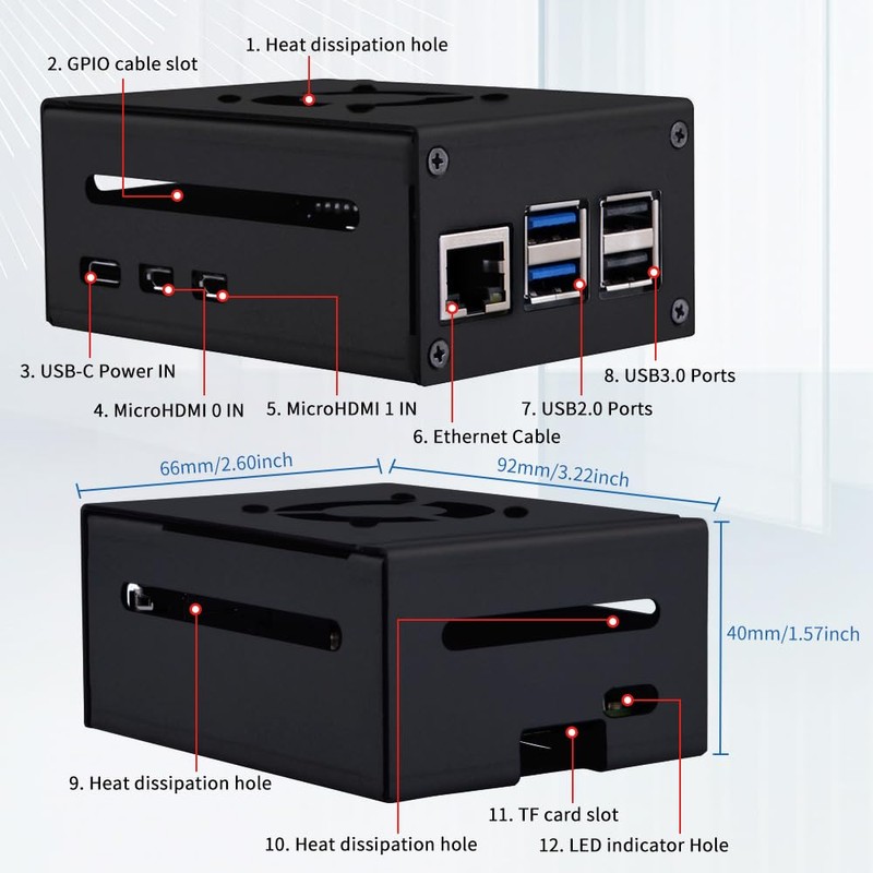 - Easy access to all ports: GeeekPi Raspberry Pi 5 case can accurately access USB-C power jack, micro HDMI ports, USB ports, Ethernet jack, SD card slot, power button, 4-lane MIPI DSI/CSI connectors and so on.