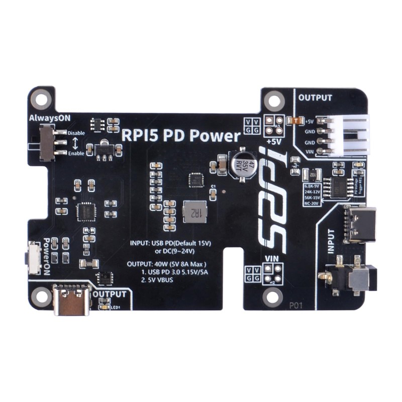 - Power input options: USB PD: default 15V input for power delivery; DC interface: 9-12V input through a dedicated DC interface; power output options; USB-C output: Delivers 40W power at 5V/8A MAX via a USB-C port; USB PD 3.0 interface: provides 5.15V@5A output through Power Delivery 3.0. 5V VBUS Output: Alternate output option for 5V power supply.