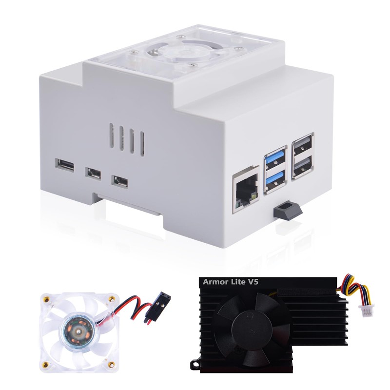 - Package includes: 1 x DIN rail modular box for Raspberry Pi 5; 1 x Armor Lite V5 active cooler; 1 x 3507 cooling fan; 1 x screws pack; 1 x screw driver. Please note: The Raspberry Pi Board and Official Active Cooler are not included in the package.