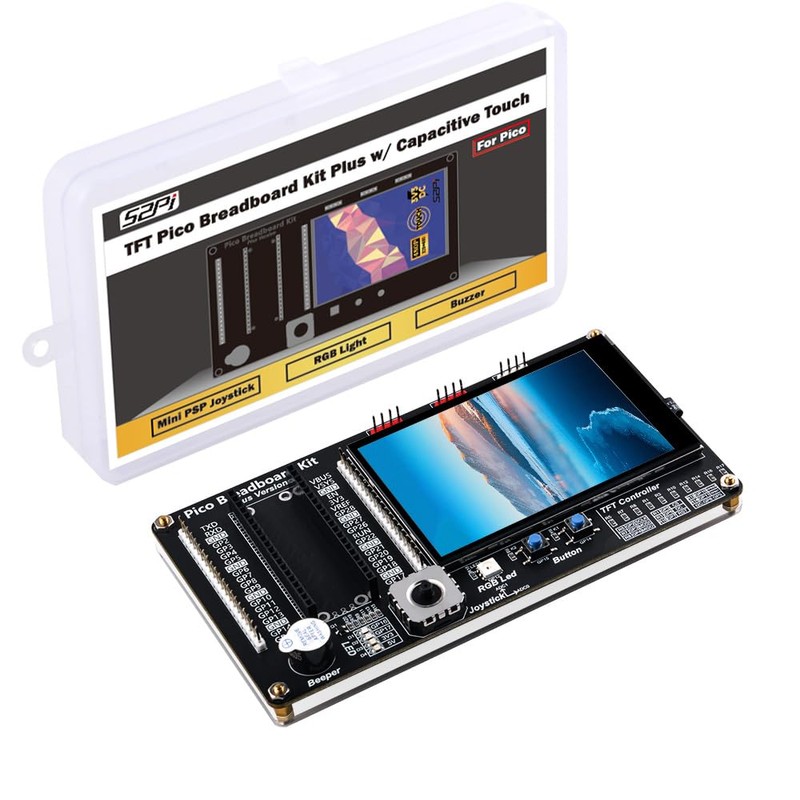 The Pico Breadboard Kit with a 3.5-inch touch screen, mini PSP joystick, RGB light, buzzer, and two buttons is a versatile electronics kit designed for prototyping and experimentation. This compact kit combines various components to create interactive projects and offers a user-friendly interface.