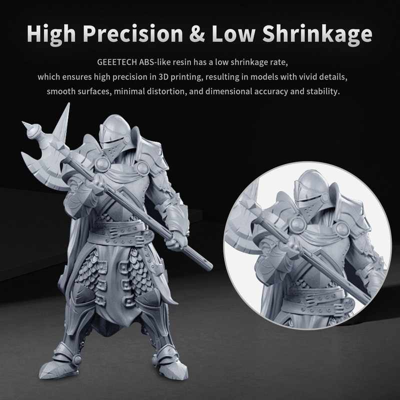 • High Precision and Low Shrinkage: Geeetech abs-like resin is specially designed to reduce volume shrinkage during the photohardening process, guaranteeing high-precision printed models with smooth rendering. Whether you're creating intricate models or functional parts, it will ensure that your prints maintain excellent dimensional accuracy and surface quality.
