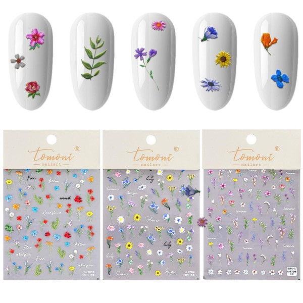 GEEHUA 3Pcs 3D Flower Nail Art Stickers, Self-Adhesive Floral Nail Stickers 3D Embossed Nails Decals Summer Daisy Sunflower Design Nails Decals for Women Girls Art Design DIY Supplies(Wild Flower)