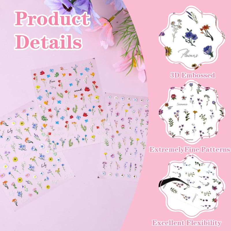- 3D embossed design: Our 3D embossed nail decals are designed as fresh petal flower plant nail stickers, including roses, daisies, sunflowers, olive branches, lily of the valley, and other styles and colors, with rich patterns and bright colors. With 3D embossed design, fine carving, perfect shape, and unique three-dimensional concave and convex effect, it gives people an intuitive, advanced, and exquisite feeling, meeting all your nail art needs