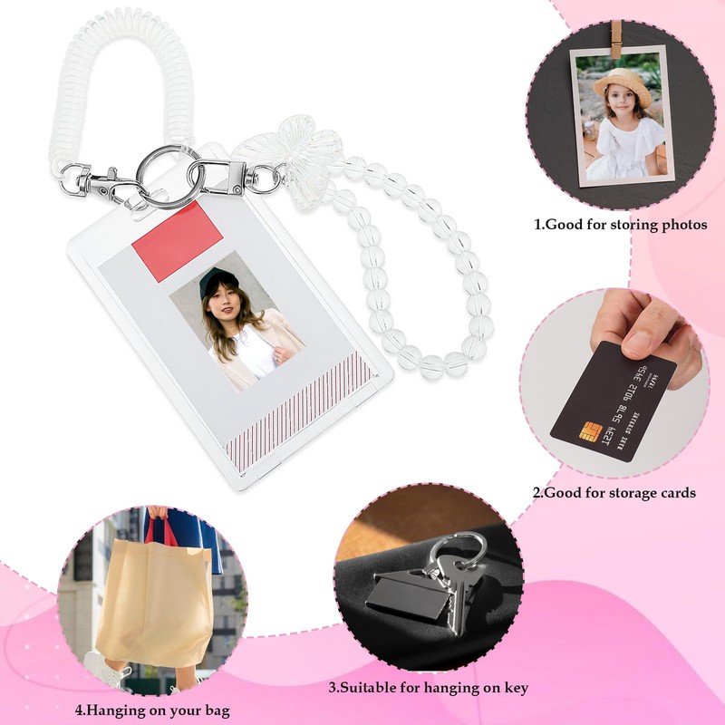 - Perfect gift: With a transparent pearl bracelet with butterfly accents and a spiral wrist spiral, this photo card holder keyring offers a refined and stylish look. It is an extraordinary gift for your loved ones on occasions such as Christmas, Halloween, birthdays, dates and more.