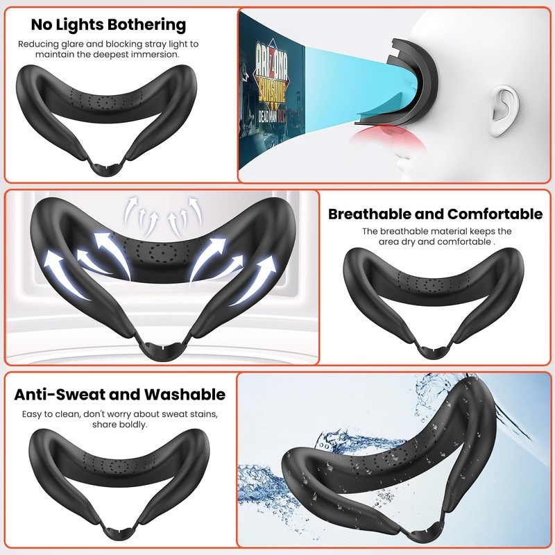 - Free Silicone Face Pad: The soft silicone face pad keeps your VR headset in place with great comfort. The interface doubles as a light blocker, reducing glare and blocking stray light so you can maintain the deepest immersion. You can easily wipe away sweat and dirt which keeps your headset clean.