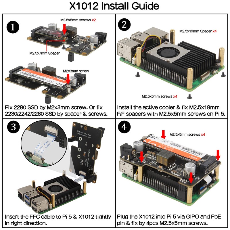- Packing List: 1 x X1012 NVMe+POE shield, 2 x PCIe FFC Cale, 10 x M2.5 x 5 mm screws, 4 x M2.5 x 19 mm F/F Spacers, 1 x M2.5 x 7 mm F/F Spacer , 1 x CM2 x 3 mm screw