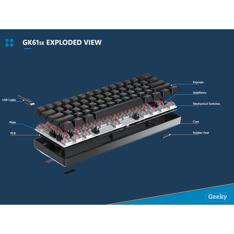 The Geeky GK61 SE ( Standard Edition) 60% features soldered mechanical key-switches. (Not Hotswappable)