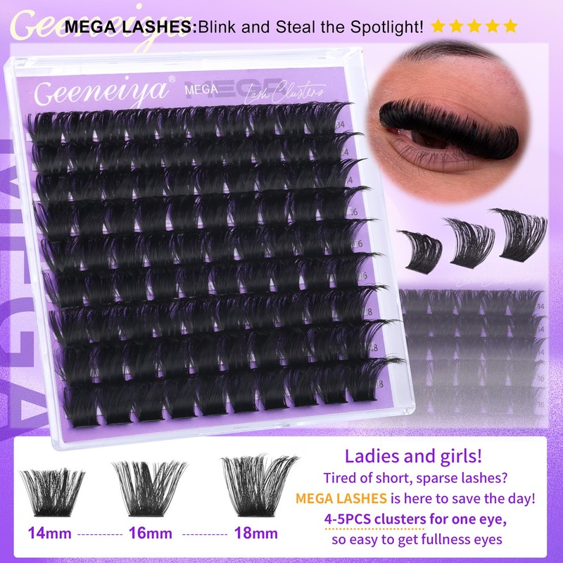 - More Details about Lash Clusters. First up—meet Mega Lashes, the ultimate lazy-girl hack! With just a few clusters, you get instant mega-volume in minutes. Next, don’t sleep on Volume and Fluffy—they’re Geeneiya’s all-time classic must-haves. And for my creative queens? Try Geeneiya’s signature Spike & Bottom combo to DIY your dream lashes and stand out from the crowd!