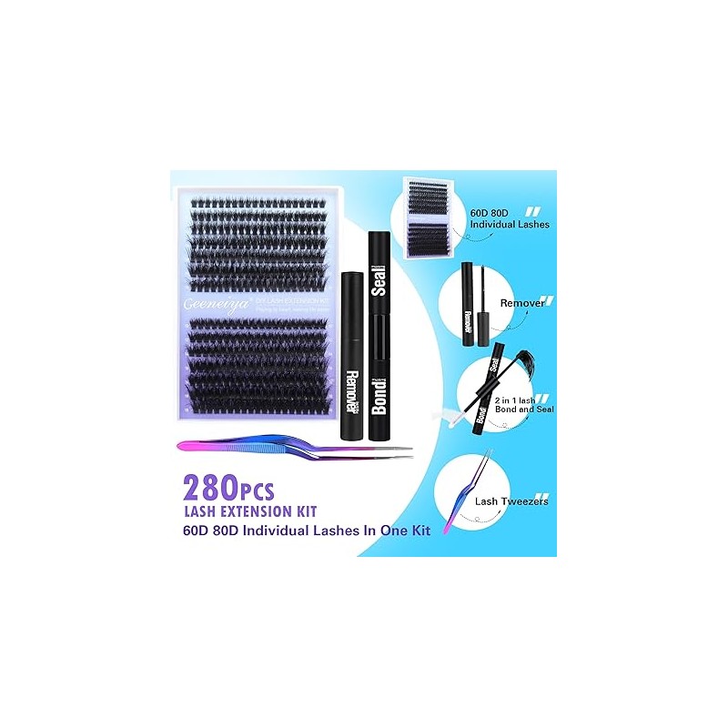 Geeneiya Fluffy Lash Extension Kit Cluster Eyelash Extension Kit Clusters Individual Lashes Kit with Lash Bond and Seal Glue, Lash Remover, Lash Applicator, User Manual for Beginners(60P+80P, 280Pcs)