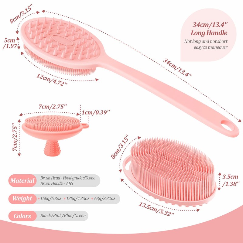 - 【Back Scrubber - Dual-side Brush head & Anti-slip Grip】2-in-1 Brush head has long & soft Bristles in one side for super lathering and deep cleaning; Other side sharp & tough Bristles for body & scalp massaging, scrubbing and dead skin removing; The back brush handle is ergonomic slightly-curved, sturdy, non-slip and strength-saving. 34cm/13.4'' Long Handle - Not long and not short, easy to maneuver. With the scrubber, you will definitely get an easy and pleasing shower!
