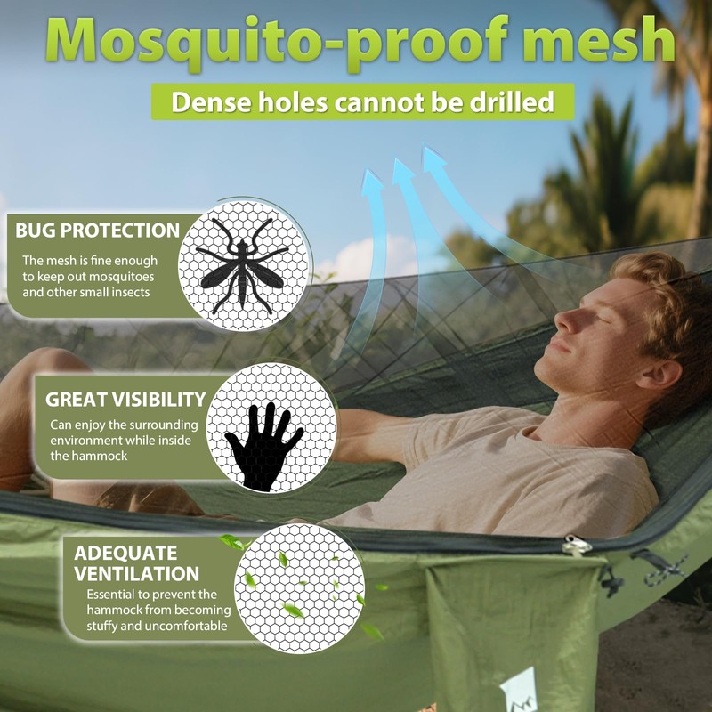 - The best protection: the outdoor hammock has practical mosquito nets, keep you away from the nuisance. You deserve a safer and more comfortable journey (insect protection and dust free).