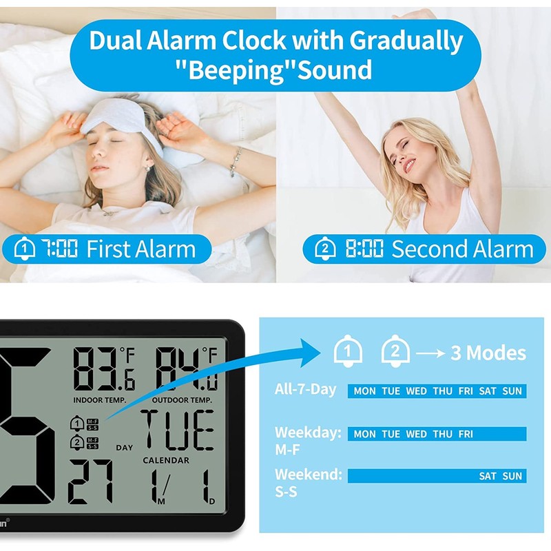 - [Dual Alarms & Snooze Function] Not only a Calendar and Thermometer, but also can be used as a loud alarm clock for bedroom. Set 2 separate alarms repeating in M-F, S-S, or M-F and S-S for different purposes. The alarm of radio controlled clock will automatically turn off if left alone for 2 minutes. With a snooze function, this atomic rectangular wall clock allows you to set 5 ~ 60 minutes’ sleep time or turn the SNOOZE function off - A step towards practical use.