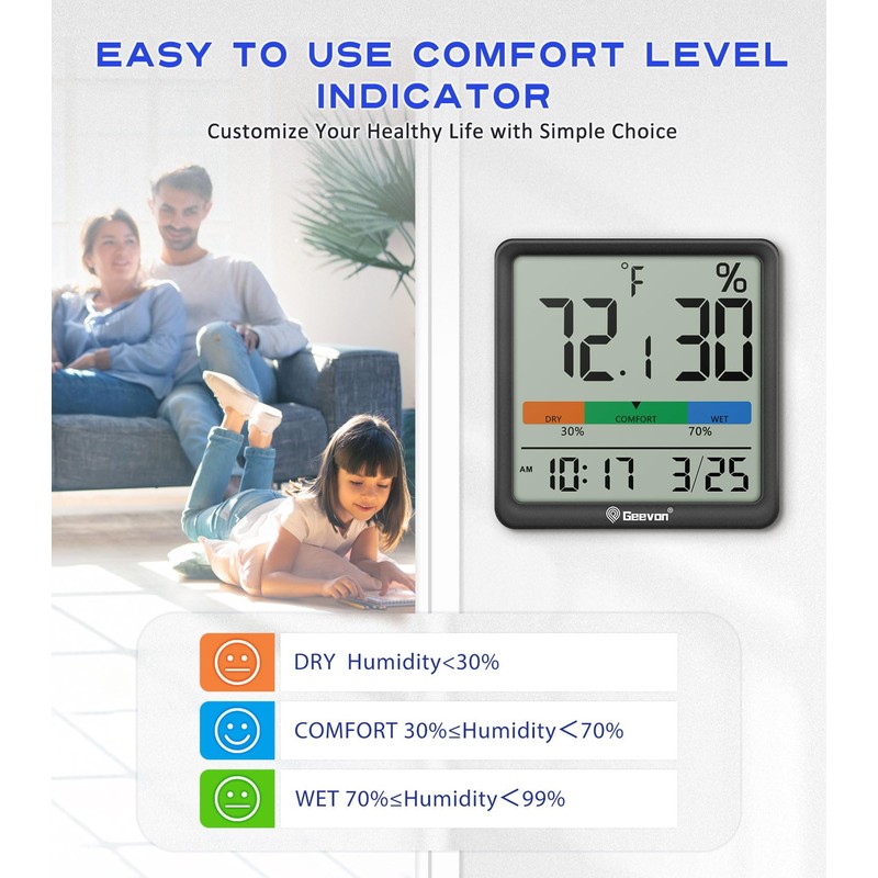 Geevon Digital Indoor Thermometer Hygrometer, Wireless Temperature Humidity Meter with Comfort Index, 1*AAA Battery, Calendar, Small Room Temperature Monitor for Home, Greenhouse, Bedroom, Black
