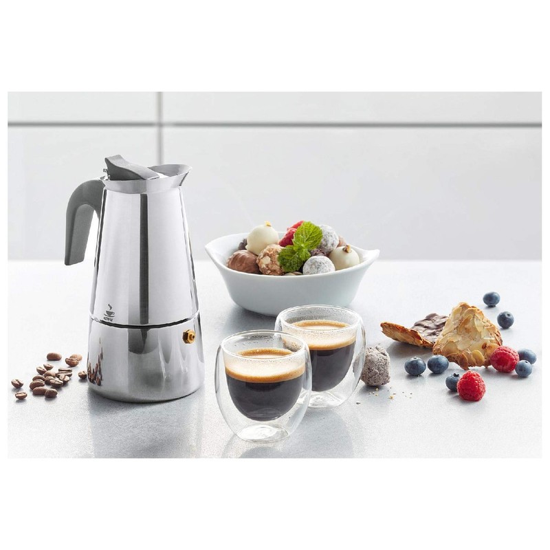 GEFU Emilio Espresso Maker + 2 Espresso Glasses, Hob Espresso Machine, Stainless Steel, Silver