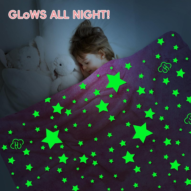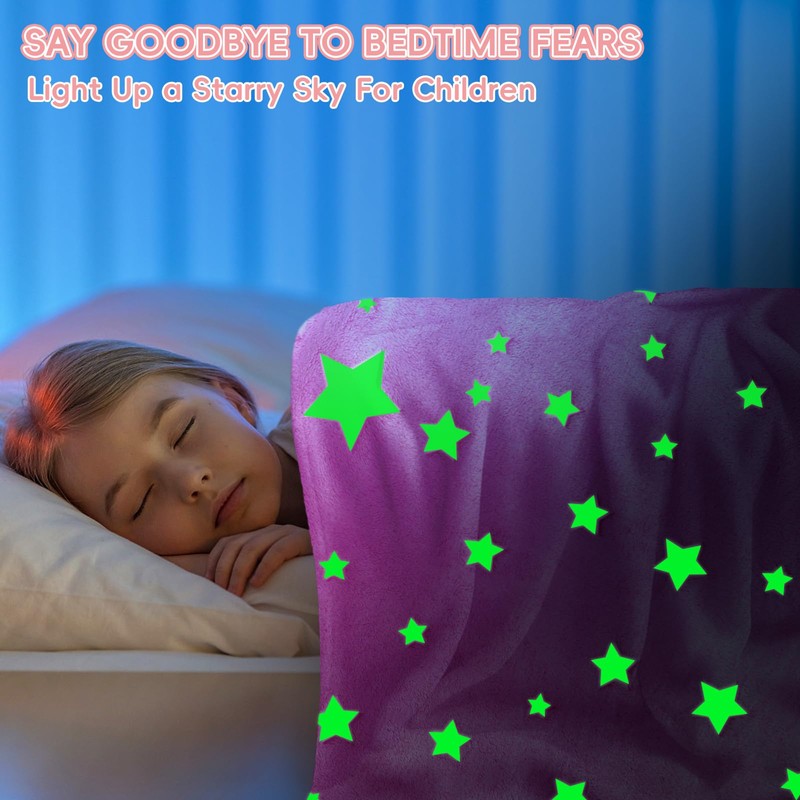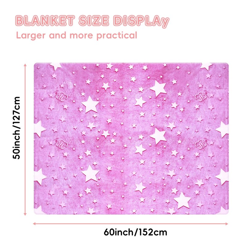 - 【SAY GOODBYE TO BEDTIME ANXIETY】Our pink stars on our blanket will glow warmly through the night, and help your kids reduce fear and night time anxiety. Kiddos will feel safe and secure drifting off to sleep wrapped in this soothing security blanket, with this glow in the dark blanket, the bedtime will be easy and fun.
