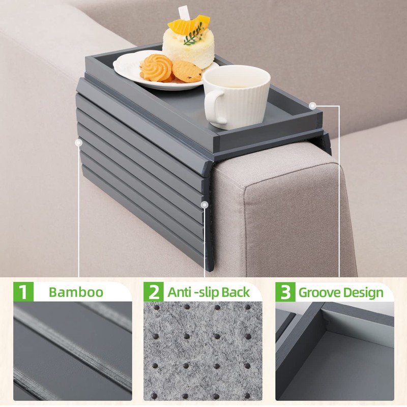 - ARM TABLE FOR COUCHES WITH ANTI-SLIP DESIGN: Ideal replacement for coffee tables, easy to use everywhere. The non-slip pad at the back of the cup holder not only sticks it tightly to the armrest of the sofa to guarantee stability during use and prevent the drink from spilling and soiling the sofa but also protects the sofa from injury by drinks and snacks.