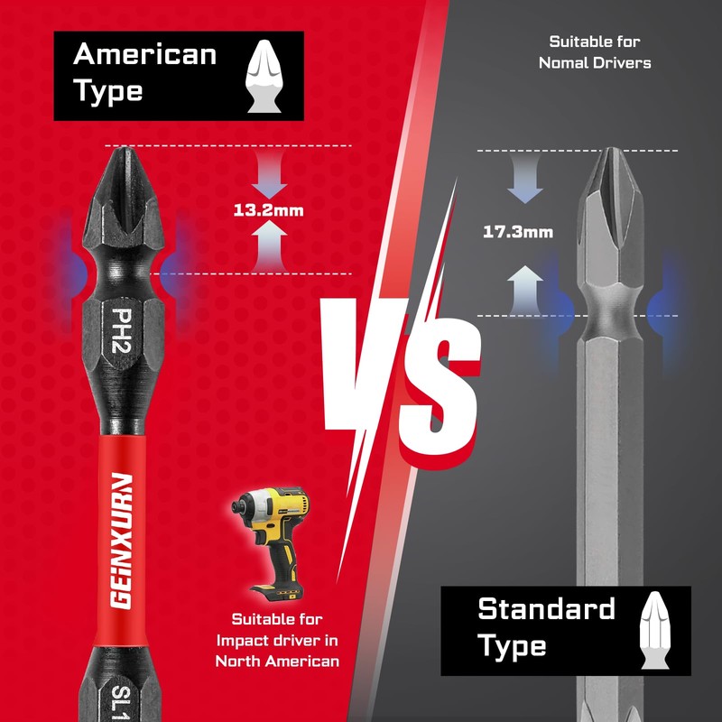 the Geinxurn Impact Drive double-ended power bits anti-impact and tough, great wear resistant. These impact tough bits are an impact rated line of screw driving bits and bit holders that have been enhanced to handled a new generation of higher torque impact drivers.
