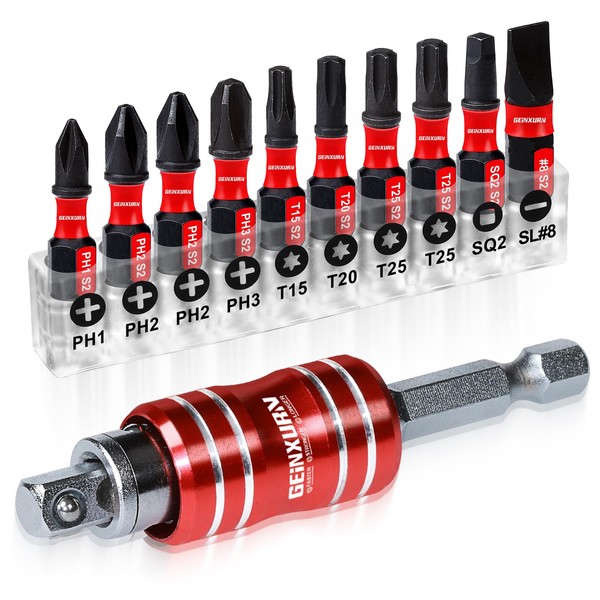 Geinxurn 1Pc 2-IN-1 Screwdriver Bit&Socket Extension Holders and 10Pc S2 Screwdriver Bits, Magnetic Quick Release Bit Holder Set Hex Shank Quick-Change Drill Bit Socket Guide