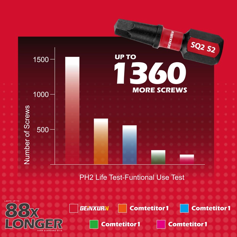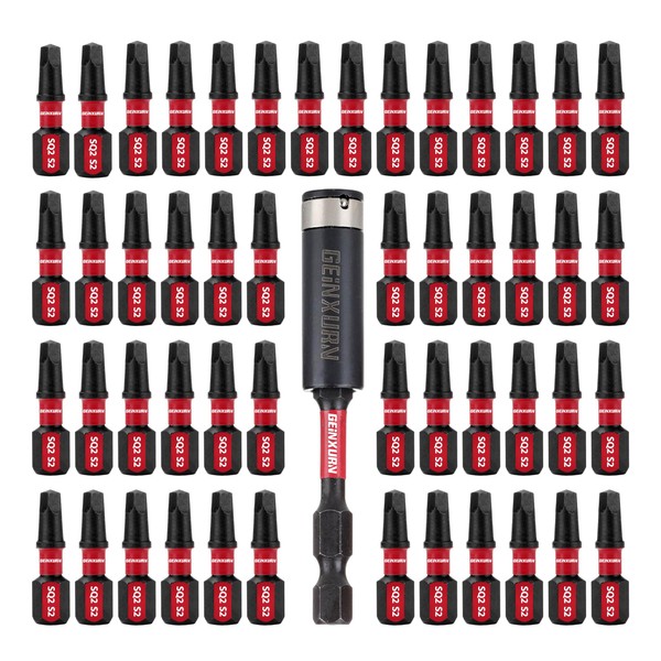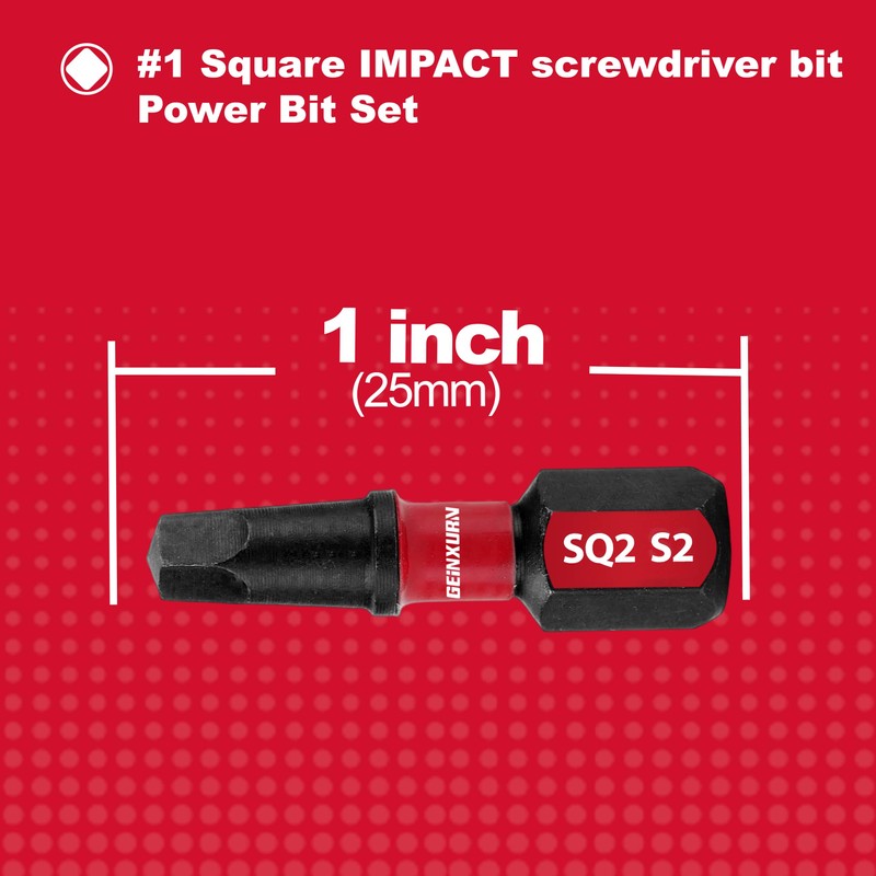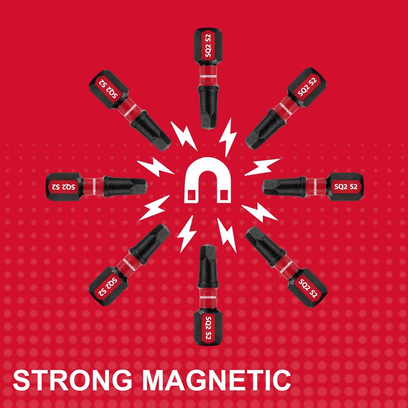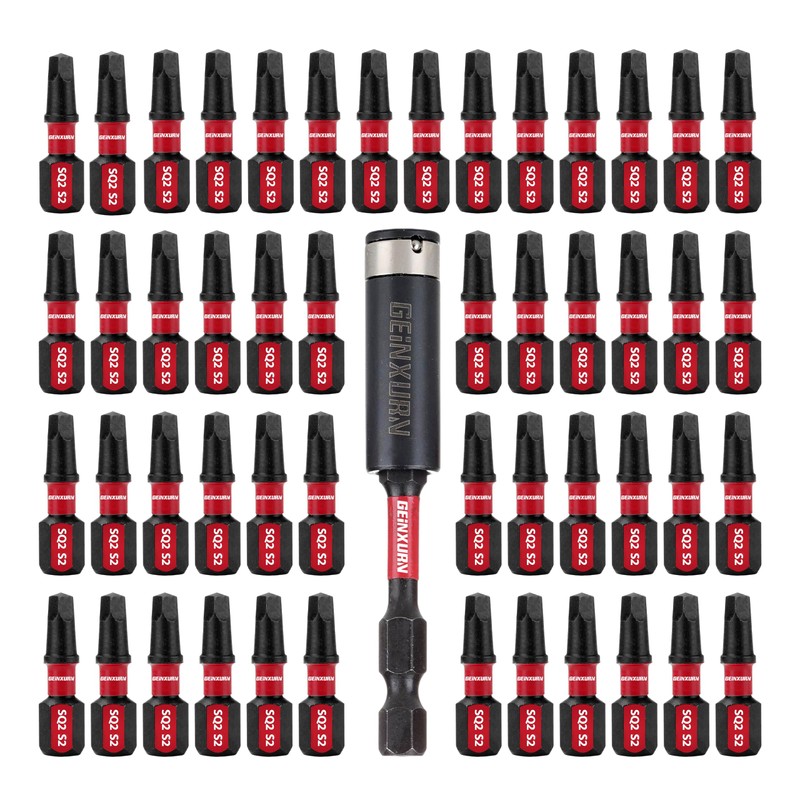 - IMPACT RATE DRIVER BITS — 50 pieces 1 inch SQ2 driver bits and 1pieces magnetic impact bit shaft holder, made of high quality S2 Alloy Steel which is anti-impact and tough, great wear resistant.