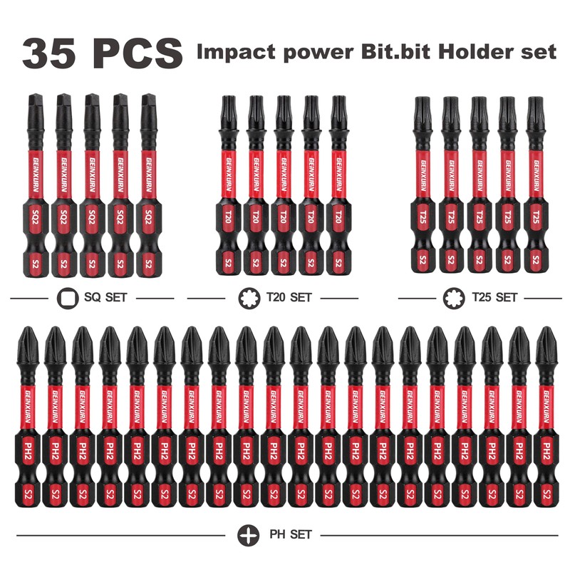 • PZCKAGE INCLUDE —Totally 35 pieces insert bit holder. (5) x T20-2 inches, (5) x T25-2 inches, (20 ) x ph2-2 inches, (5 ) x SQ2-2 inches.
