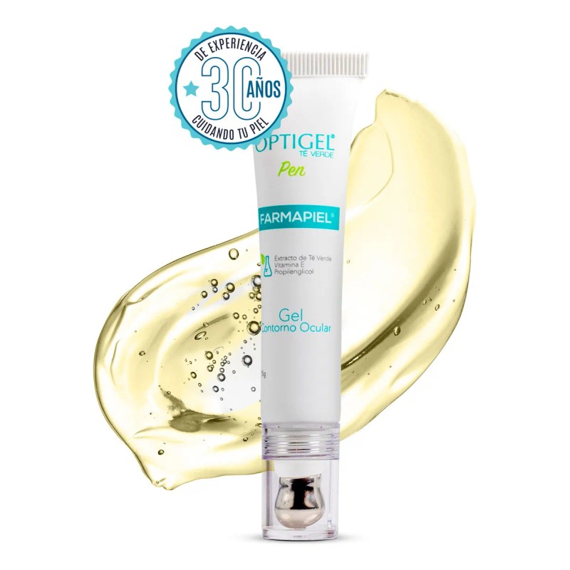 - Optigel Pen Gel contorno de ojos para todo tipo de piel. Atenúa las ojeras, disminuye visiblemente las bolsas de los ojos y las líneas de expresión causadas por el cansancio, estrés y alergias, formulado con vitamina E, té verde, hamamelis y antioxidantes. Brinda protección antioxidante contra los rayos UVA y UBV. Puedes complementar su uso con protector solar para una protección adicional contra los rayos UV. Optigel Pen es un gel en formato de pluma con aplicador con punta metálica diseñado para dar un ligero masaje en frío en el contorno de ojos. Relajante y desinflamatorio. Gen anti ojeras, bolsas y arrugas. Reafirmante, hidratante y antiinflamatorio. Modo de empleo: Fácil de transportar, lo puedes aplicar en una capa fina dos veces al día sobre la piel limpia y seca, desde el área interna (lagrimal) hacia la externa. Ideal para todo tipo de piel, este gel atenúa las ojeras y reduce de manera visible las bolsas, ojos hinchados y arrugas en la zona alrededor de los ojos. INGREDIENTES: Incluye té verde con efecto desinflamatorio, vitamina E como antioxidante, extracto de hiedra para desinflamar, y Theophyllisilane C como reafirmante. Complementa tu skin care con Sérum Facial de Ácido Hialurónico 8 beneficios de Farmapiel, con 8 tipos de ácido hialurónico al 2% y vitaminas A, C y E en microesferas. RECOMENDADO POR DERMATÓLOGOS