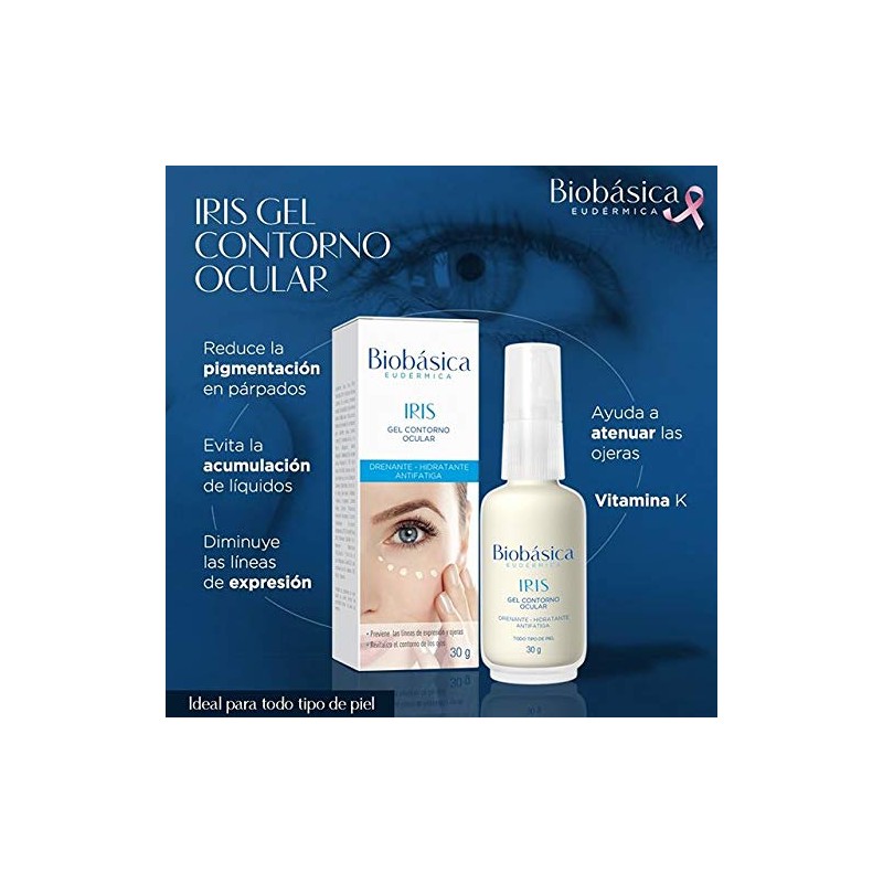 - Gel para el cuidado delicado y revitalizador del contorno de ojos. La acción drenante y la Vitamina K reduce la pigmentación y evita la acumulación de líquidos en el contorno de los ojos