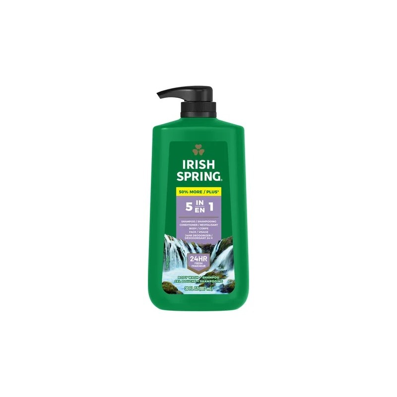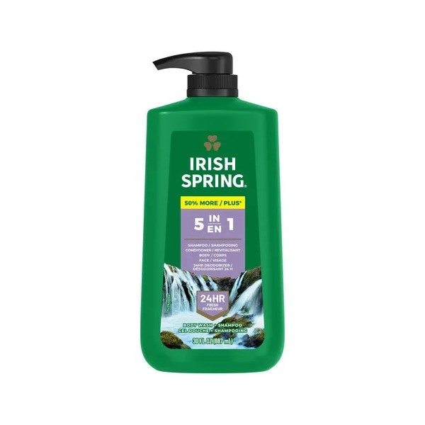 - Qué está incluido: Una botella de 30 onzas líquidas de gel de baño Irish Spring 5 en 1 para hombres