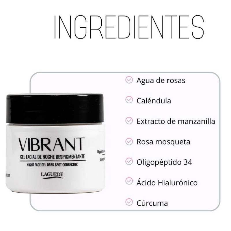 - Hidratante, Manzanilla, Arnica, Rosa Mosqueta, Agua de Rosas, Acido Hialurónico, Cúrcuma y Oligopéptido 34