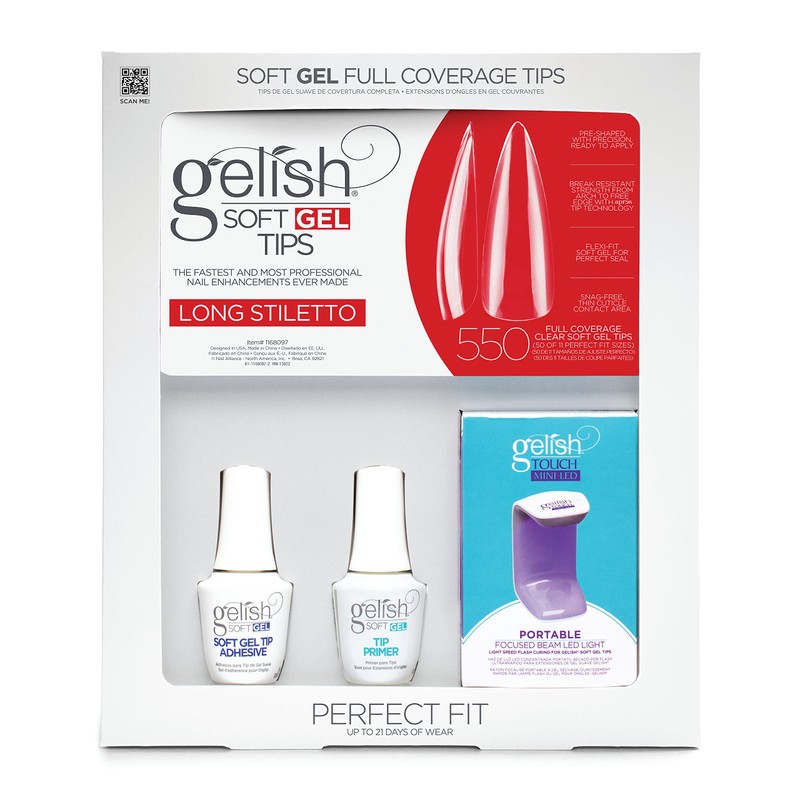 Gelish Soft Gel Intro Kits, Press On Gel Nails, Gel Tips Nail Kit, Full Nail Tips, Nail Kit with featured Mini LED Light, Perfect Kit, Full Coverage Tips. (Long Stiletto 550 Count Nail Kit, 1 Kit)