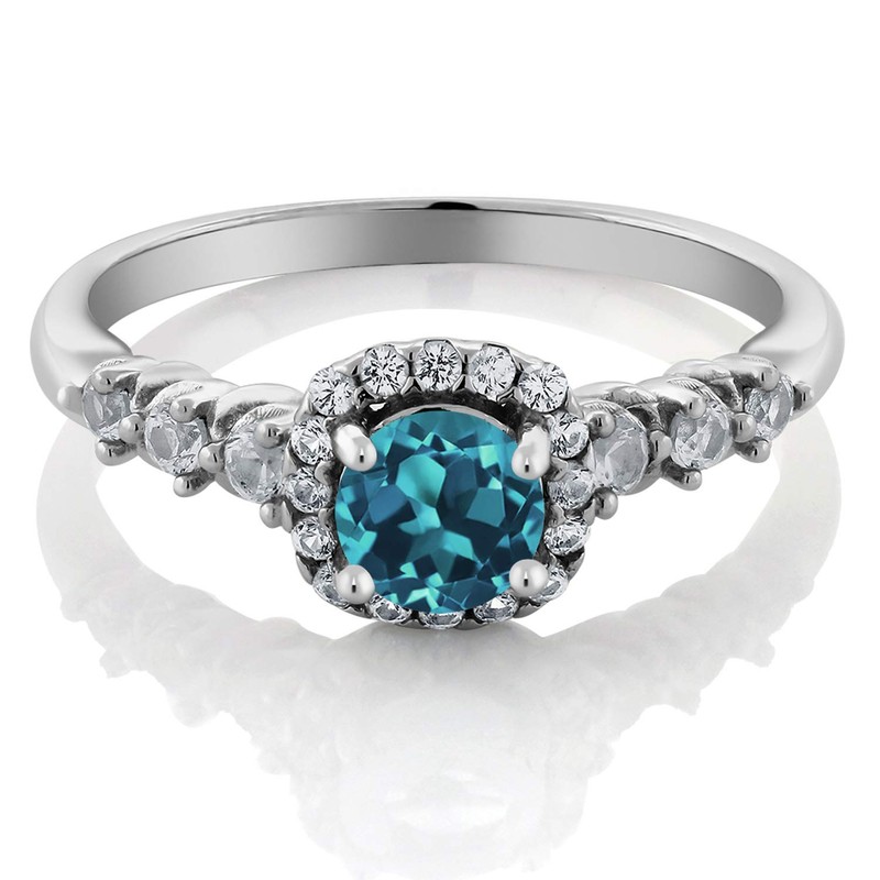 - Stunning Gemstone Duo: This engagement ring features a stunning combination of a 5MM round-cut London blue topaz gemstone as the center stone and sparkling white created sapphires on the band, with a total carat weight of 1.12 Cttw, creating a captivating and elegant display on the finger.