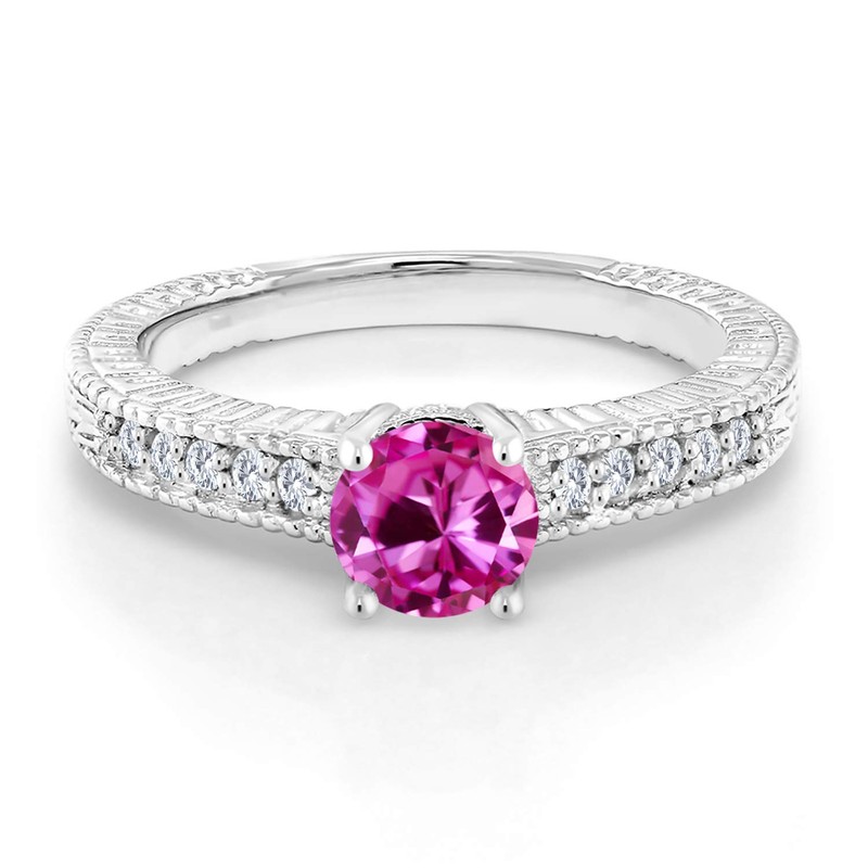 Gem Stone King 1.15 Ct Round Pink Created Sapphire E-F Lab Grown Diamond 925 Silver Engagement Ring (Size 9)